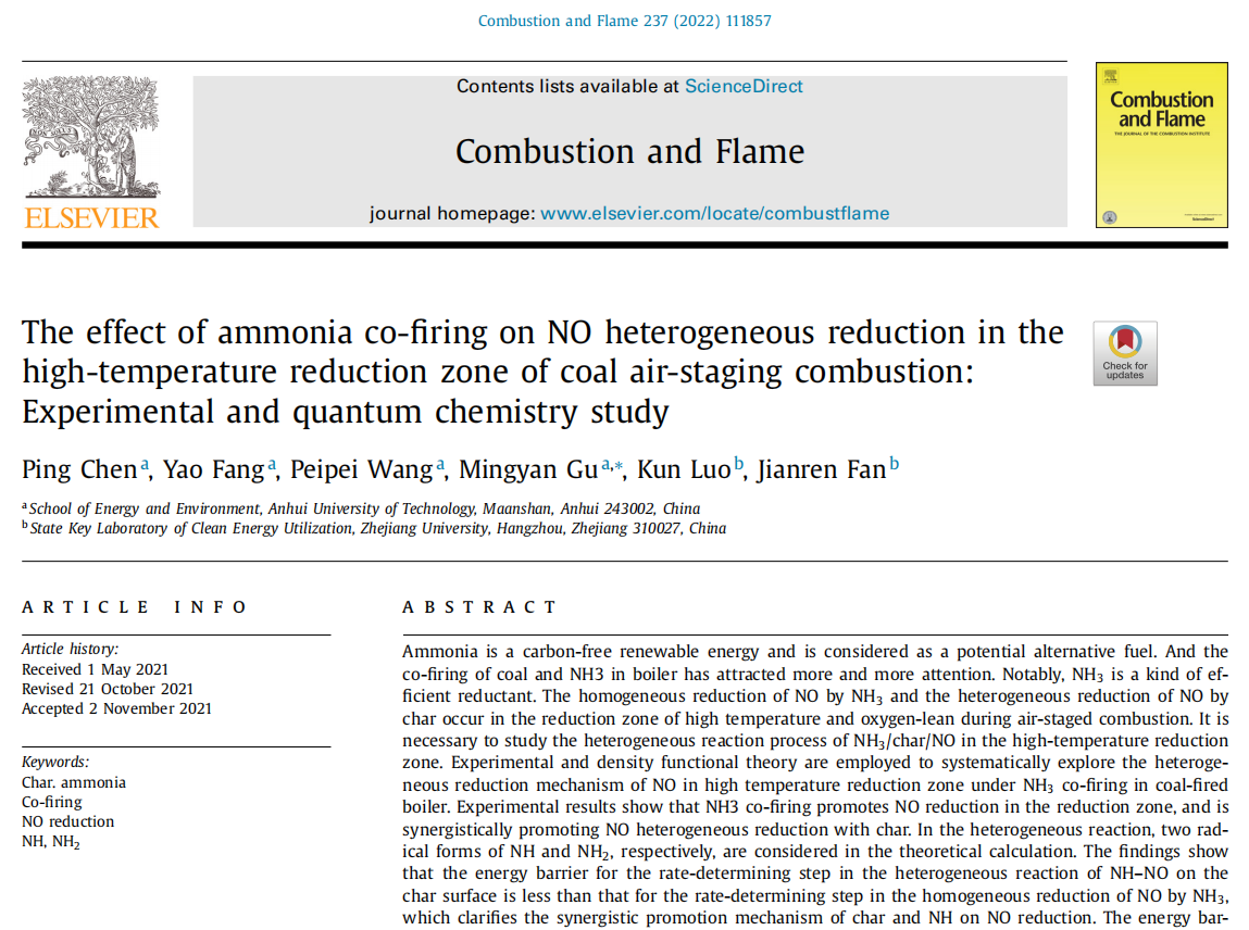 近日,2138CC太阳集团青年教师陈萍在燃烧领域国际权威期刊《Combustion and Flame》上,以第一作者身份发表了题为“The effect of ammonia co-firing on NO heterogeneous reduction in the high-temperature reduction zone of coal air-staging combustion: Experimental and quantum chemistry study”的论文。该论文通讯作者为2138CC太阳集团顾明言教授,合作者为浙江大学能源工程学院樊建人教授和罗坤教授。2138cn太阳集团古天乐为第一单位,研究工作得到国家重点研发计划项目(2017YFB0601805)的资助。