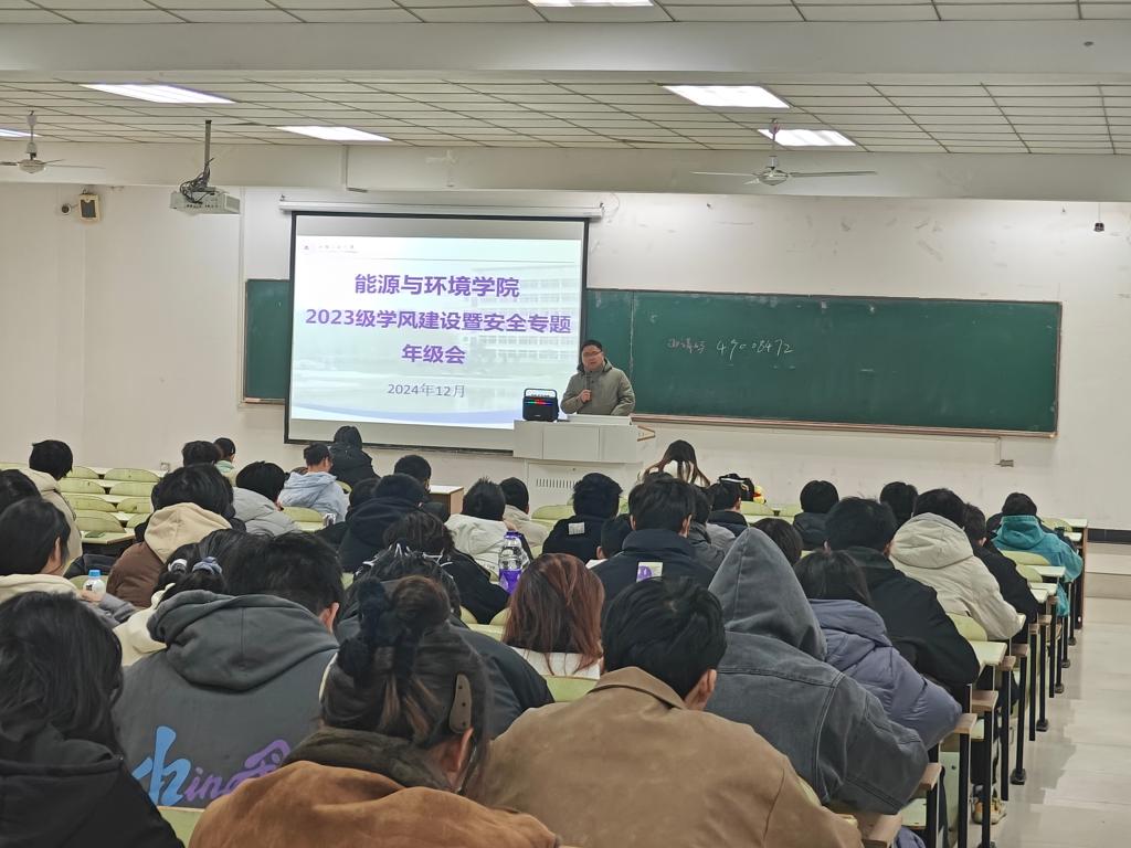 为总结学风建设现状,提高诚信考试意识,引导学生树立安全意识,12月27日上午,能环学院于教三南103召开了期末学风建设暨安全教育专题年级会。会议由2023级辅导员费丽主持,副院长卫军帅、辅导员吴飞、周虹晶和全体学生参会。
