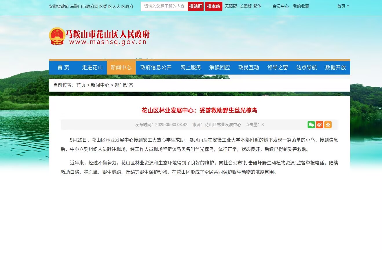 近日,马鞍山市花山区人民政府发布新闻表示,花山区林业发展中心接到安工大热心学生求助,妥善救助野生丝光椋鸟。