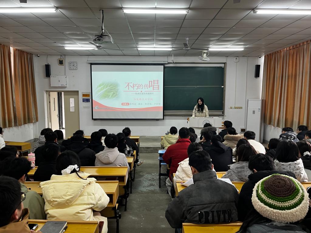宣讲会上,张雪莲同学以深厚的理论功底和生动的叙事方式,引领大家走进了一段由旋律与歌词承载的红色记忆。她通过对皖南地区流传的多首革命民谣进行细致梳理与深入解读,揭示了这些质朴歌声背后所蕴藏的厚重历史。张雪莲阐述道,皖南民谣不仅是地方民间艺术形式,更是新四军与人民群众鱼水情深、并肩战斗的真实见证,是传播革命理想、鼓舞军民士气的特殊精神武器。她从民谣的创作背景、传唱过程、歌词内涵及其时代价值等多个维度,生动再现了那段烽火岁月里,中国共产党领导的人民军队如何扎根群众、依靠群众,以及人民群众如何用最真挚朴素的艺术形式表达对党的拥护、对子弟兵的热爱。她指出,这些“不朽的传唱”穿越时空,至今仍回荡着信仰的力量、初心的温度与奋斗的激情,是新时代青年党员传承红色基因、赓续精神血脉的宝贵资源。