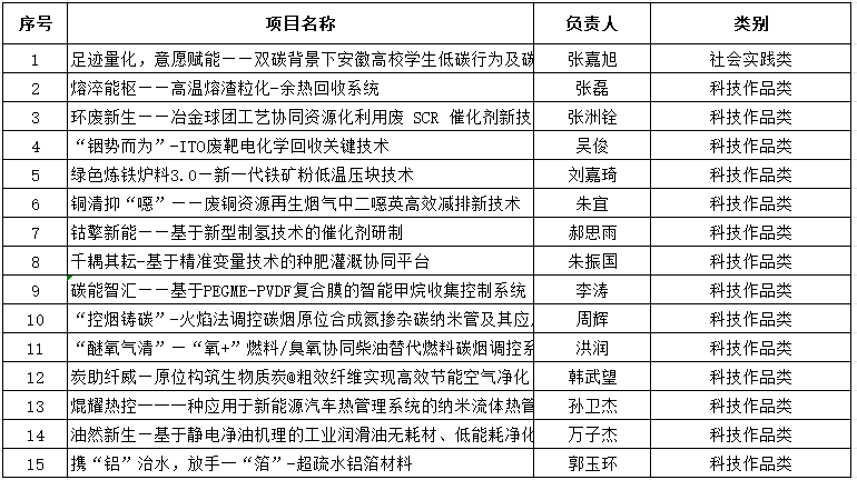 其中,《携“铝”治水,放手一“箔”——疏水铝箔材料》《油然新生—基于静电净油机理的工业润滑油无耗材、低能耗净化系统设计》2个项目推荐参加国赛,另外参加“焓谷•晶宇杯”第二届安徽省大学生节能减排社会实践与科技竞赛获得一等奖的13个项目也推荐参加国赛。参加国赛具体名单公示如下(排名不分先后):