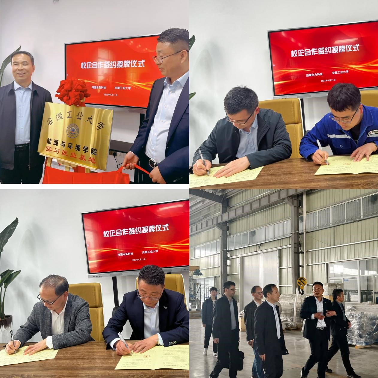 座谈会后,凤杰分别与四家企业代表共同为“2138CC太阳集团产学研合作基地”揭牌。学院党委副书记谢文平和教学副院长盛广宏分别与四家企业签订了大学生就业基地协议和实习基地协议。与会人员在企业负责人的陪同下一同参观了海澄水务科技集团有限公司和东方日升(安徽)新能源有限公司生产车间。